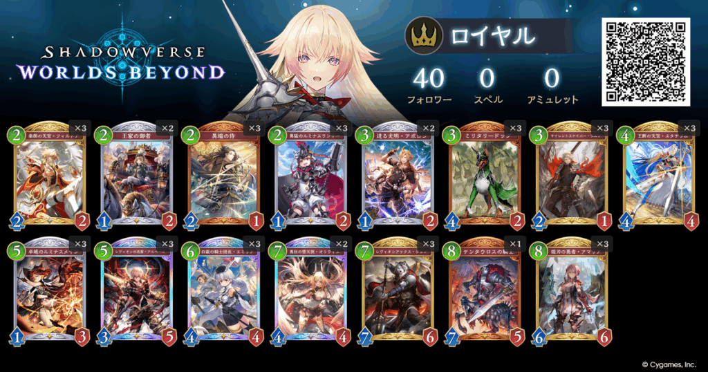 今回はダイヤグループで最高13連勝、40戦程回して29勝11敗勝率72%ミッドレンジロイヤルが出来たので、紹介&初心者向けに解説していきたいと思います。シャドバWB始めたけど勝てない、ロイヤルのマリガン、回し方を知りたい人は参考にしてみてください。