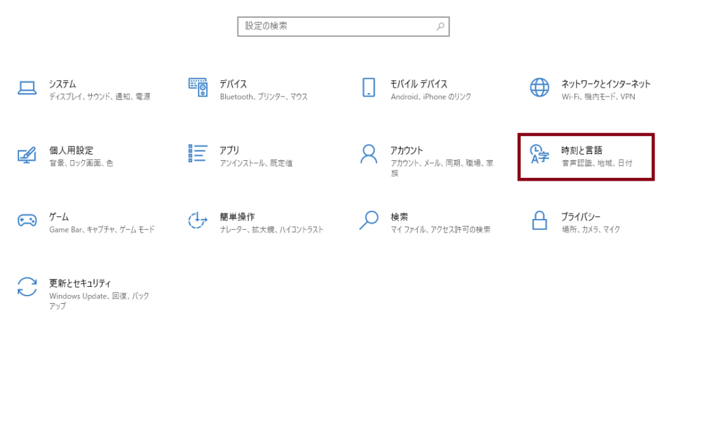 Windowsの設定を開き、「時刻と言語」を選択してください。