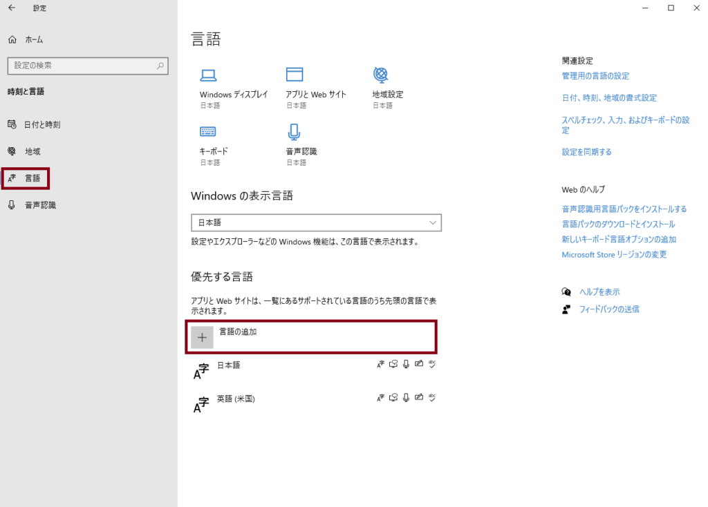 「言語」から「言語の追加」をクリック