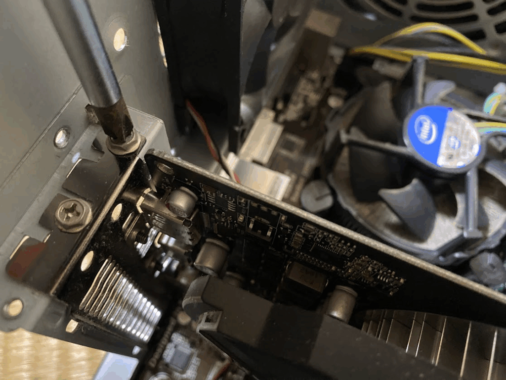 スロット部分のネジをドライバーで外しましょう。このグラボはスロットを2つ使っているので、ネジ2つ外します。