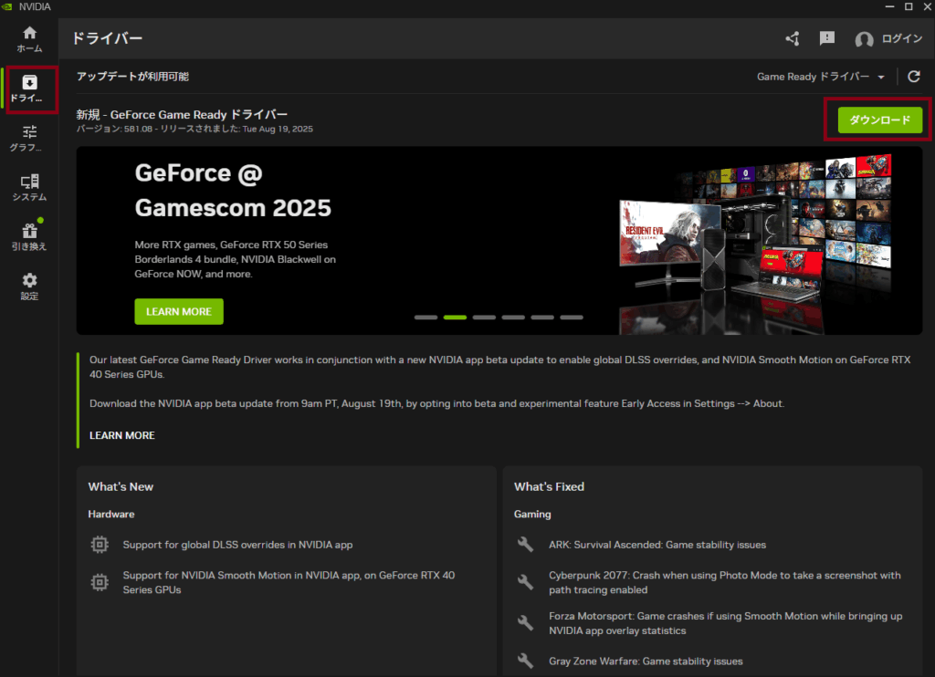 NVIDIA App(旧GeForceExperience)をインストールして、最新ドライバーをインストールしてください。